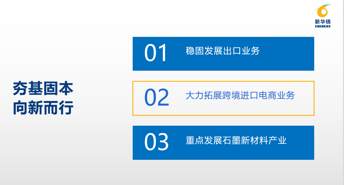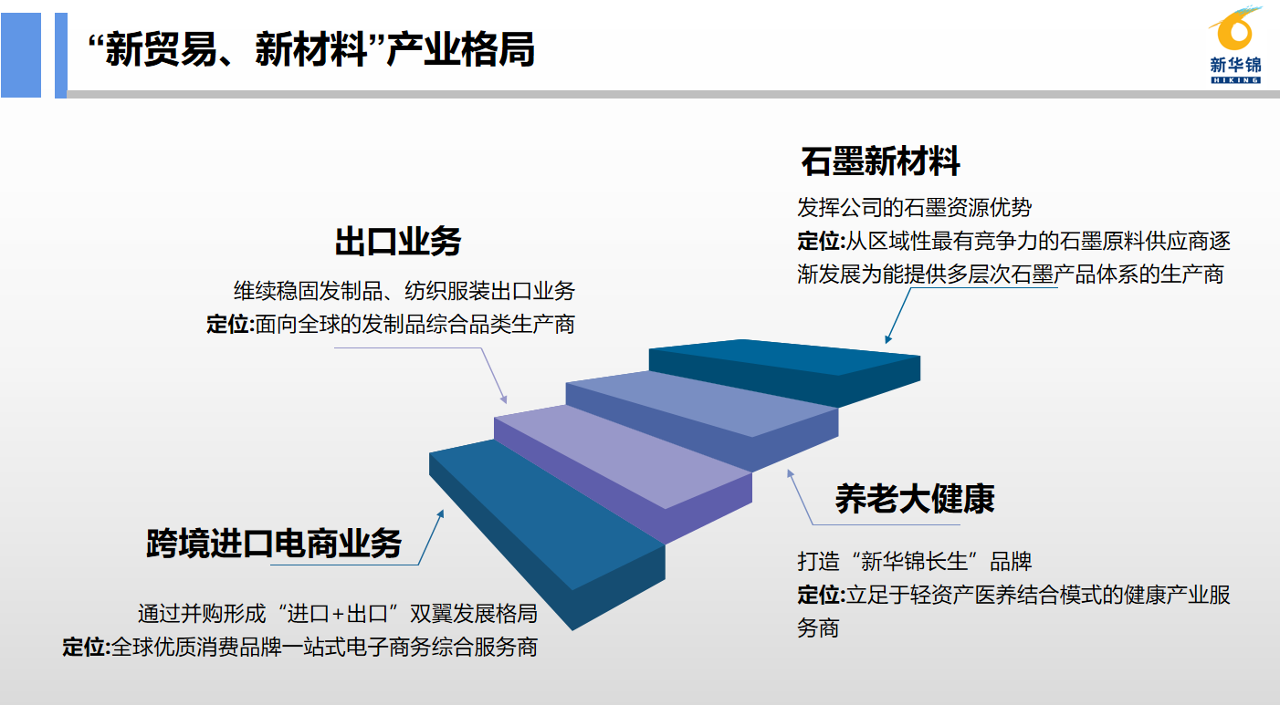 山東新華錦國(guó)際股份有限公司總部位于山東青島,是新華錦集團(tuán)旗下A股上市公司。公司在國(guó)際貿(mào)易業(yè)務(wù)領(lǐng)域深耕多年,主營(yíng)發(fā)制品和紡織品服裝產(chǎn)品的生產(chǎn)加工及業(yè)務(wù)出口業(yè)務(wù),同時(shí)布局了石墨新材料產(chǎn)業(yè)和跨境進(jìn)口電商業(yè)務(wù),已逐步形成了“兩大核心戰(zhàn)略”“四個(gè)業(yè)務(wù)板塊”,初步建立了“新貿(mào)易、新材料”的產(chǎn)業(yè)格局。